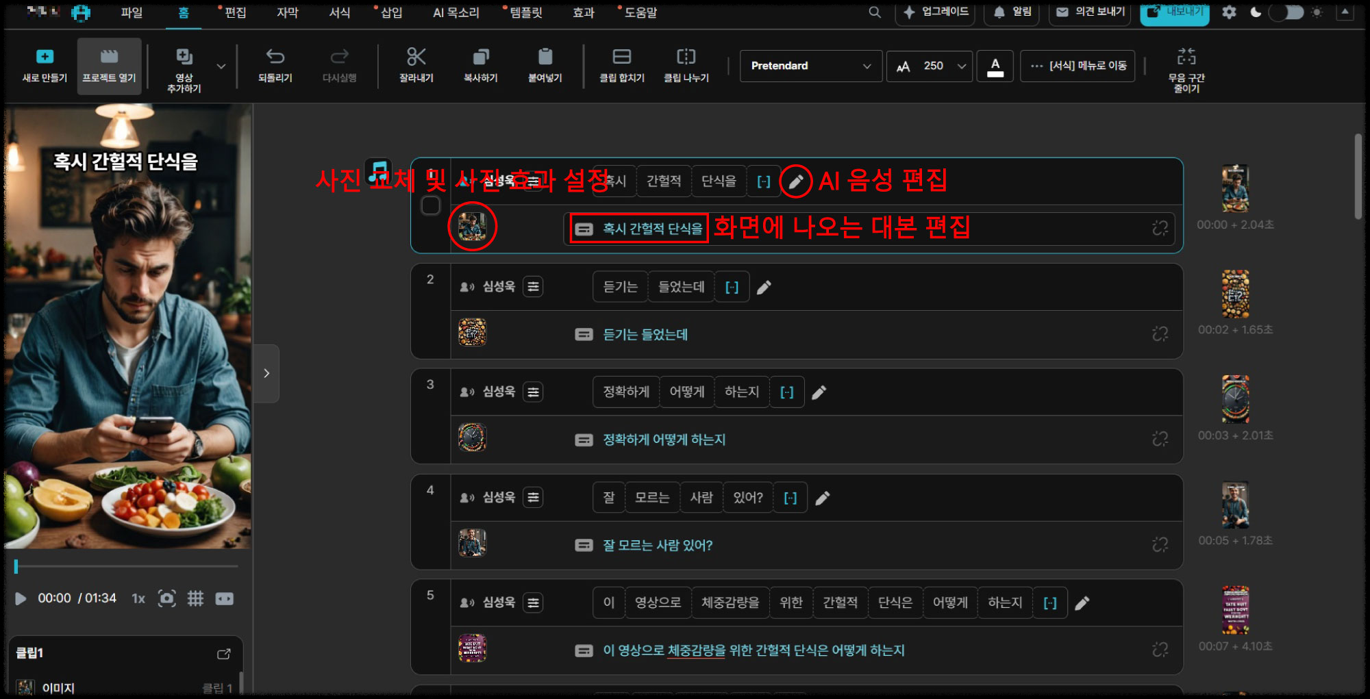 - 생성된 걸 그대로 올리게 되면 띄워쓰기 또는 AI 말하기가 조금 어색할 수 있기 때문에 편집을 해줘야 합니다. 연필처럼 생긴 걸 클릭하면 AI말하기 음성을 수정, 대본편집, 사진 교체 및 효과 등 수정이 가능합니다.