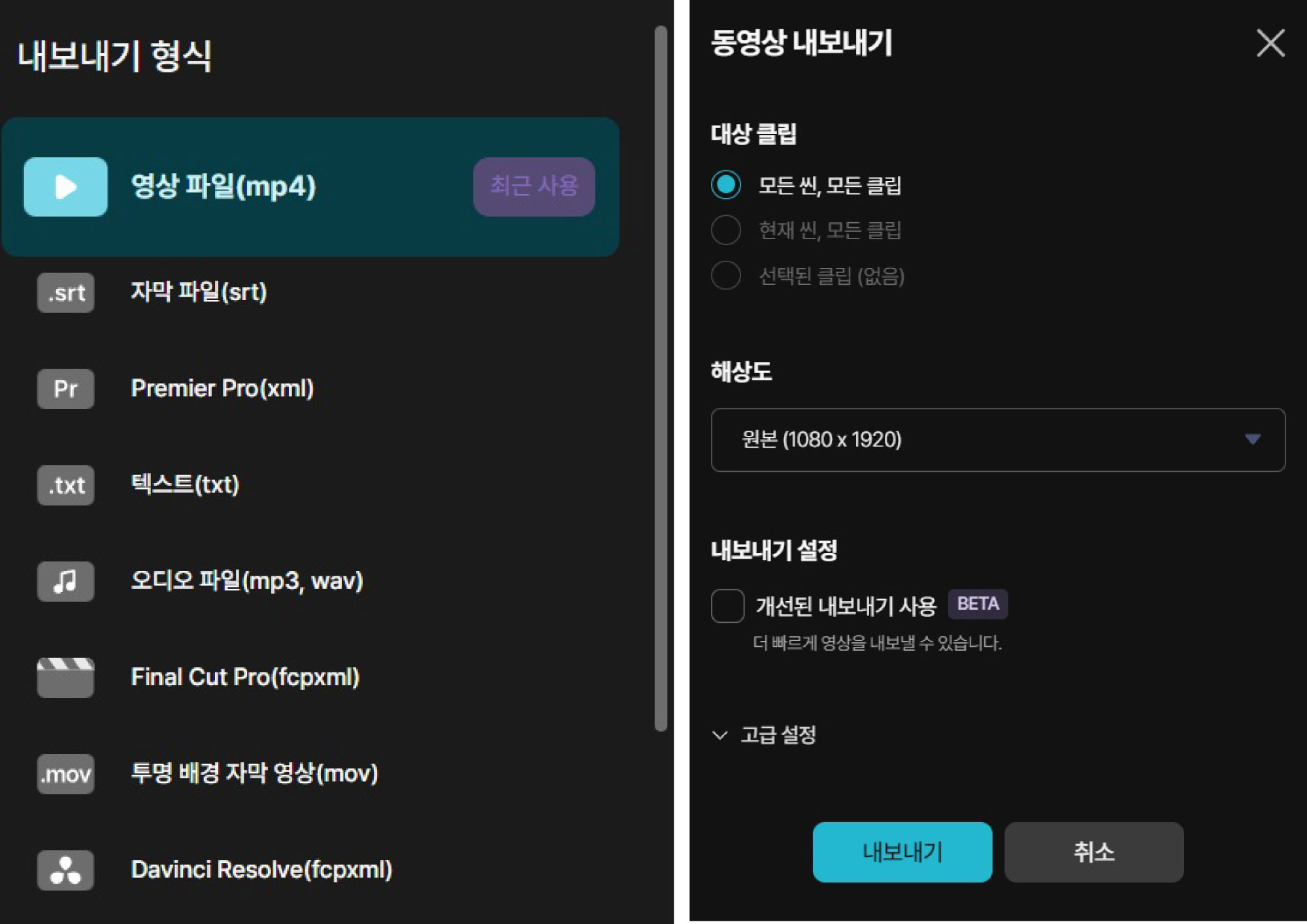 - 수정이 완료되면 내보내기를 클릭하여 동영상을 어떤 파일형식으로 내보낼지 선택하시면 됩니다.