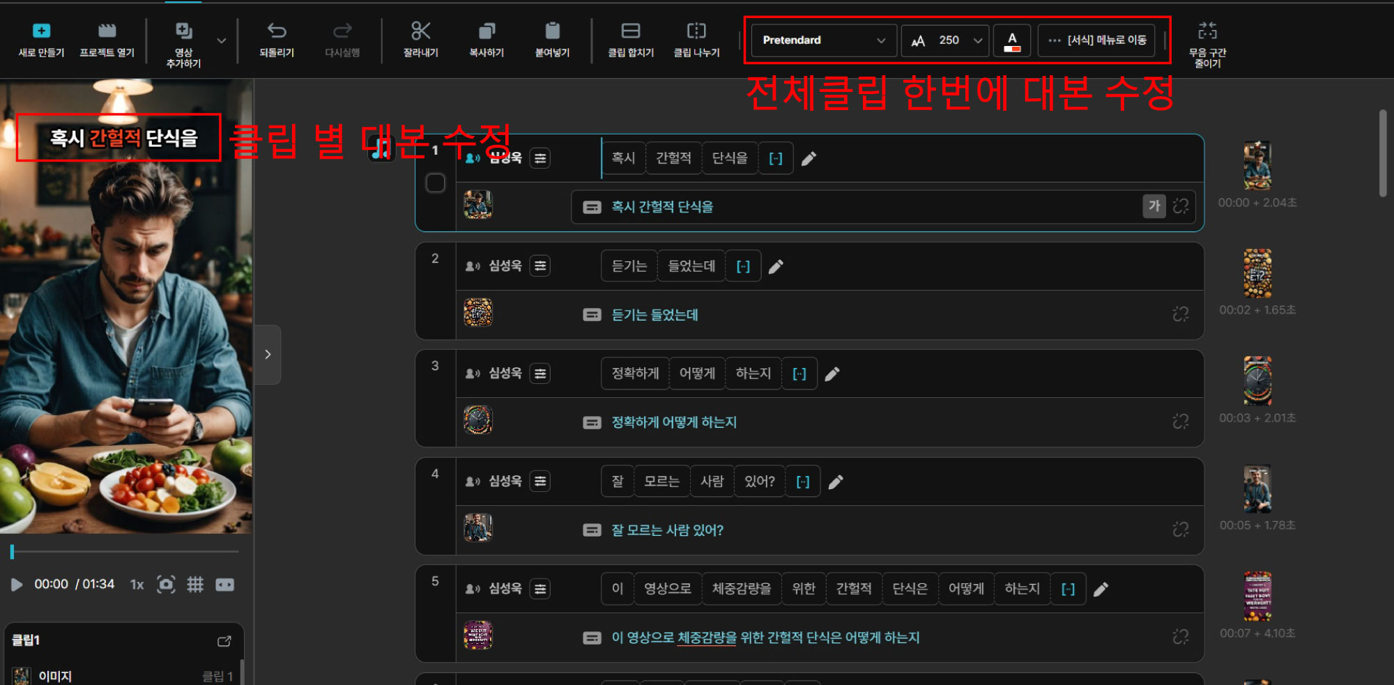 - 화면에 나오는 대본을 직접 클릭해서 클립별로 글자색과 대본을 수정할 수 있고, 전체클립 대본을 한번에 수정도 가능합니다.