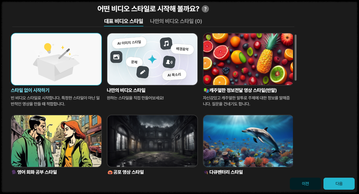 - 어떤 스타일로 영상을 만들지 선택해야 합니다. 여러가지 스타일이 있으니 상황에 맞춰서 설정을 하시면 됩니다.
