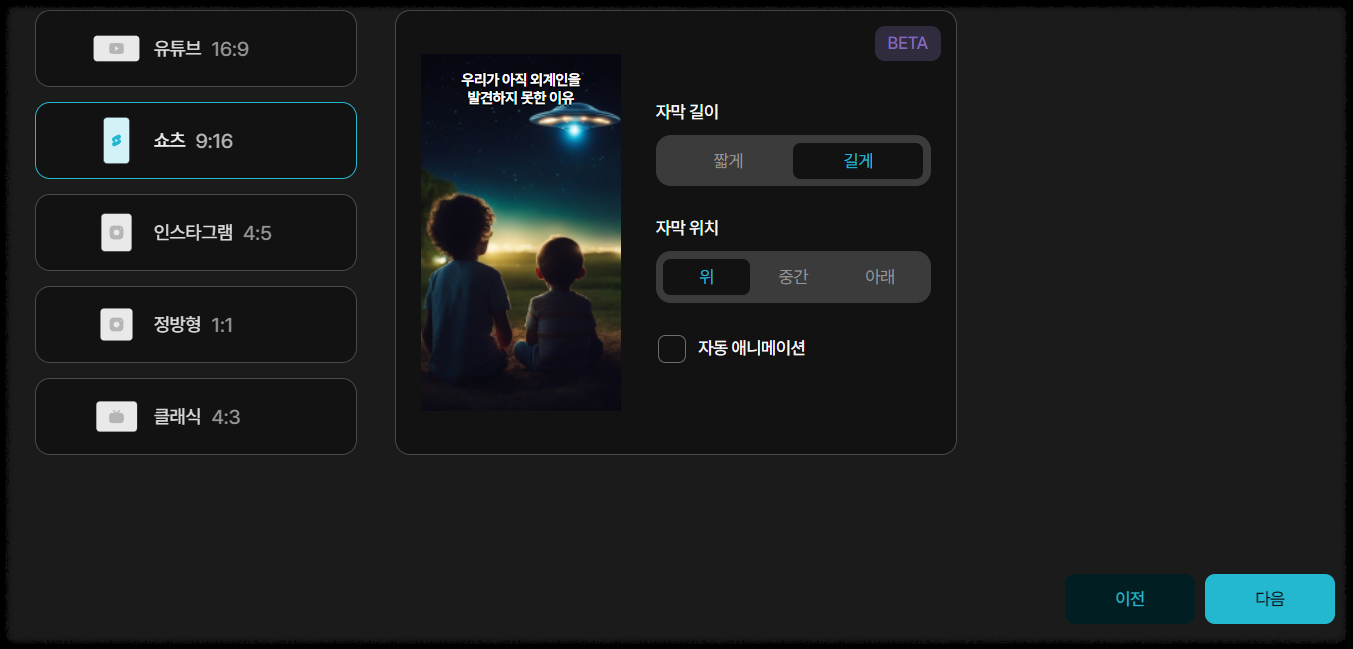 - 선택하면 아래와 같은 화면이 나오는데 쇼츠 9:16을 선택하시고 자막길이를 짧게할지 길게할지와 자막 위치를 선택해 줍니다.